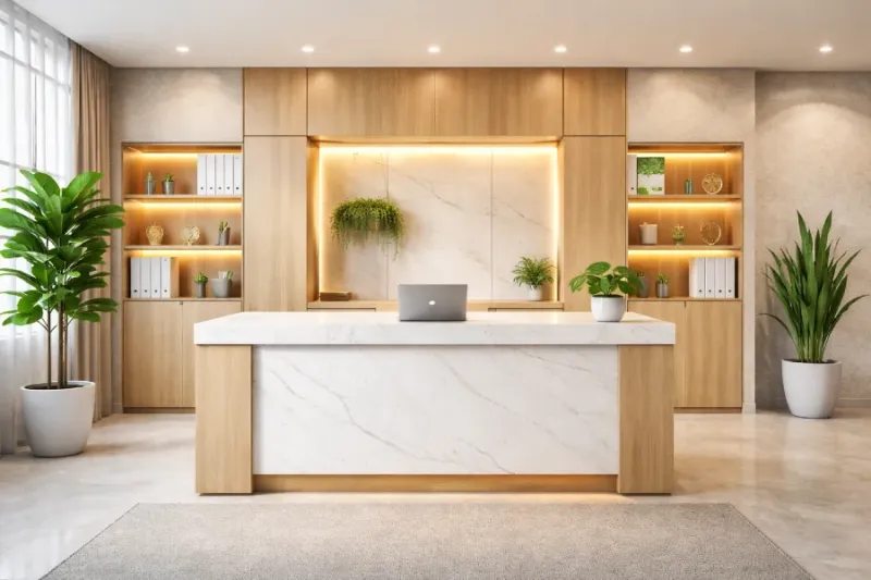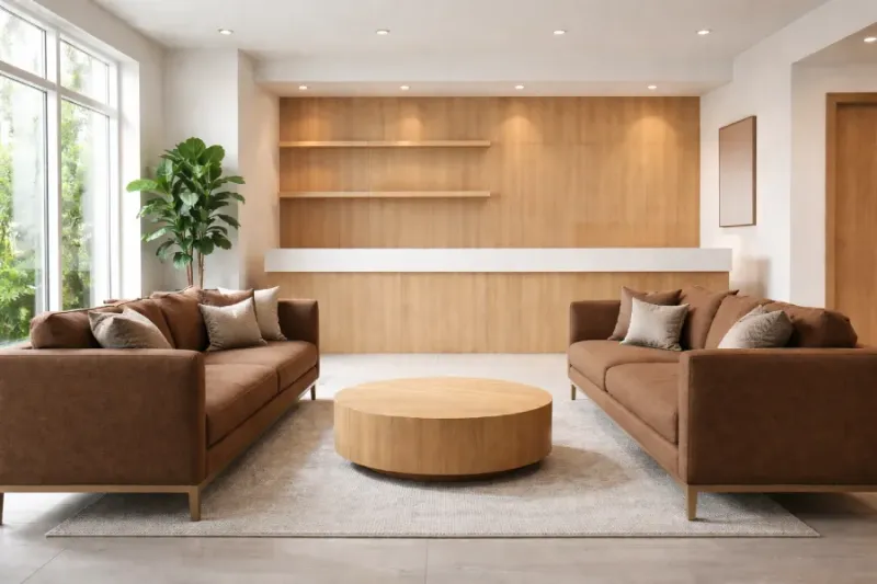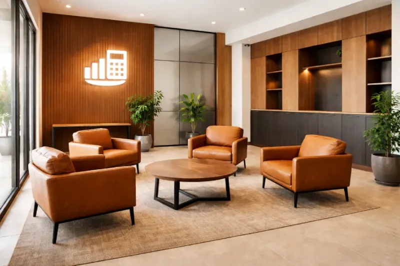 Professional furniture in the waiting room and reception area conveys a sense of order, stability, and financial confidence.