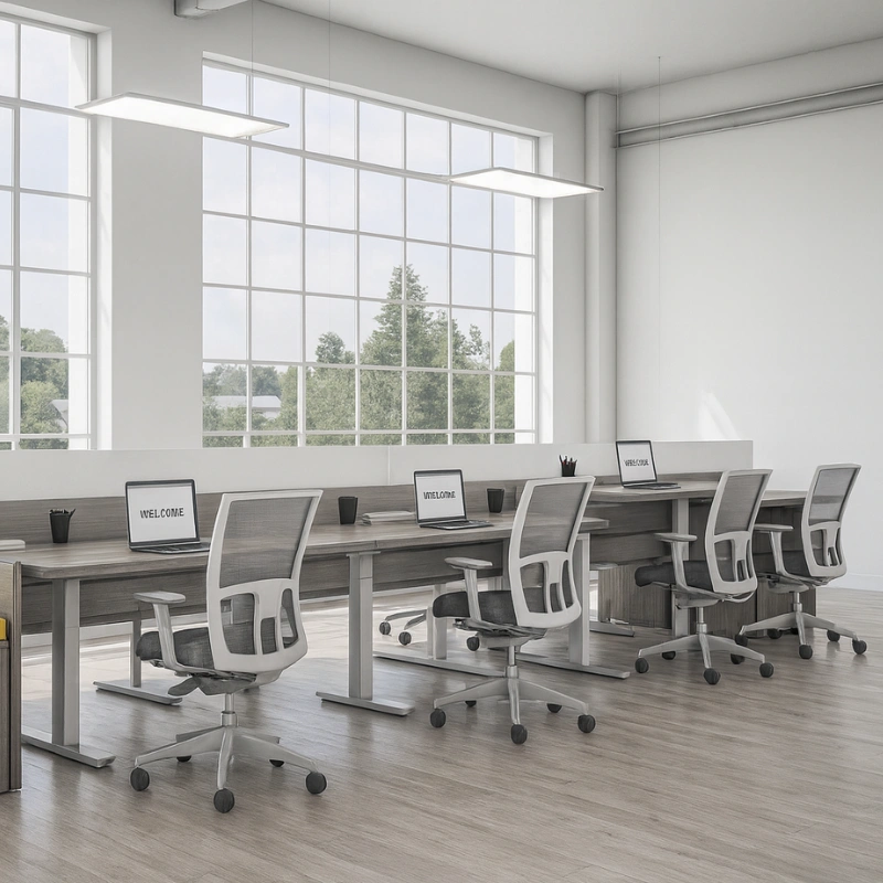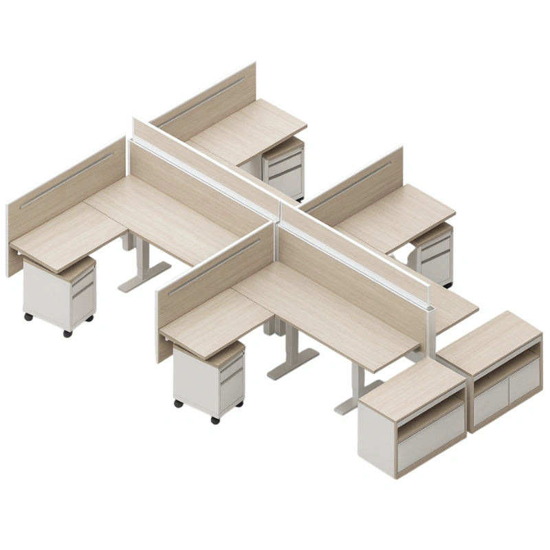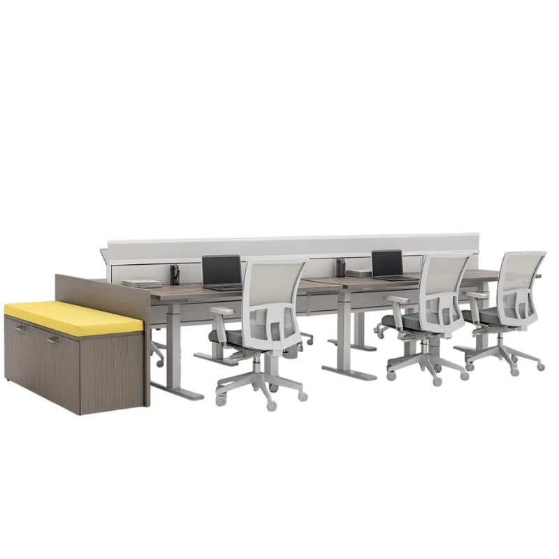 EPB511’s set of workstations can be arranged as you see fit, with a tall straight end panel. An additional raceway is placed between workstations all along the row, for extra privacy. On a person’s left side, the L-shape offers a bit of extra work surface, with room for the included mobile pedestal drawers. Smooth, scratch-resistant laminate can offer a contrast, with your choice of many colors. On the opposite end is a set of metal storage drawers and shelving, keeping other office supplies within easy reach. Create team environments that promote transparency. Evolve Power Beam offers a light and airy alternative to panels without sacrificing power or data needs. User-controlled elements like height-adjustable surfaces also support healthy spaces for workers.