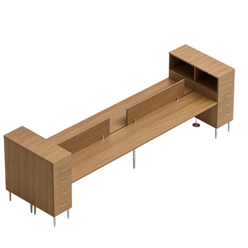 This office desking set consists of 4 workstations. A tall file tower adds cabinets at the ends, and a bit more privacy to boot. Keep your office supplies orderly with the shelving at the top for the things you would like to keep on hand. The smooth work surfaces/tabletop is given a scratch-resistant laminate, with your choice of many colors.