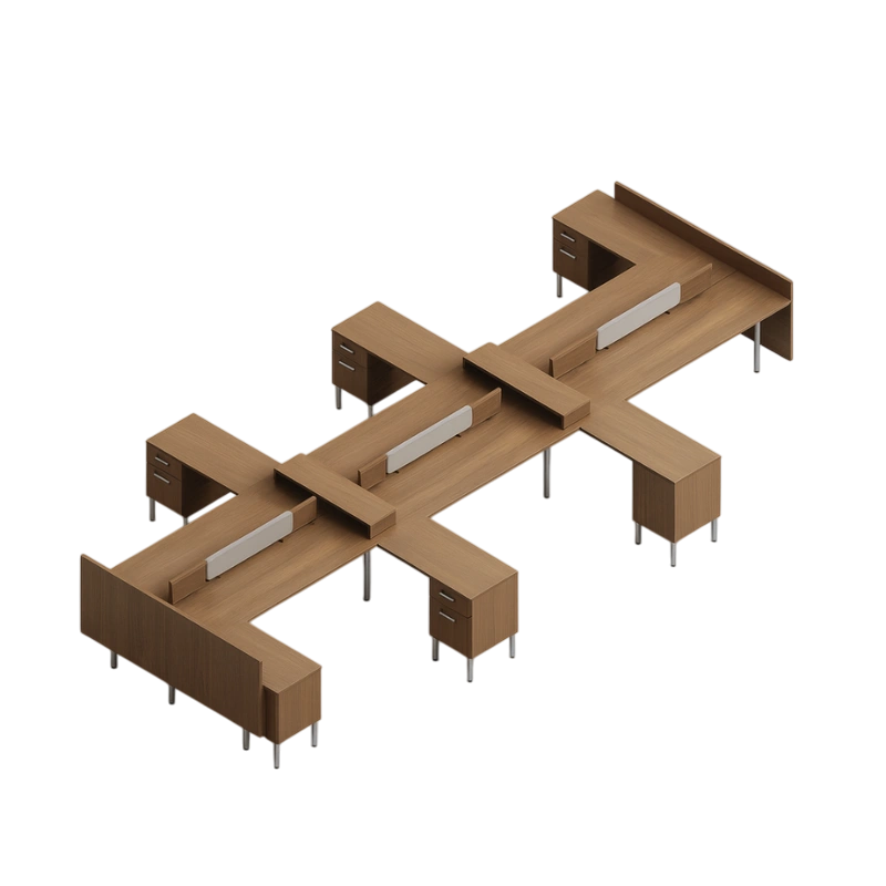 This office desking set consists of 6 workstations, with a return for each person jutting out at the left side. Pidgeon-hole shelving brings things together at the center, holding collaborative files and small supplies. Each person can use the drawers on the other side for locking up important files and for general storage. The smooth work tabletop is given a scratch-resistant laminate, with your choice of many colors.