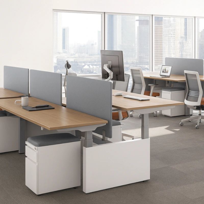 - Height adjustable benching on a per-workstation level, with simple up/down touch controls. Anti-collision functionality offers safety in the movement.