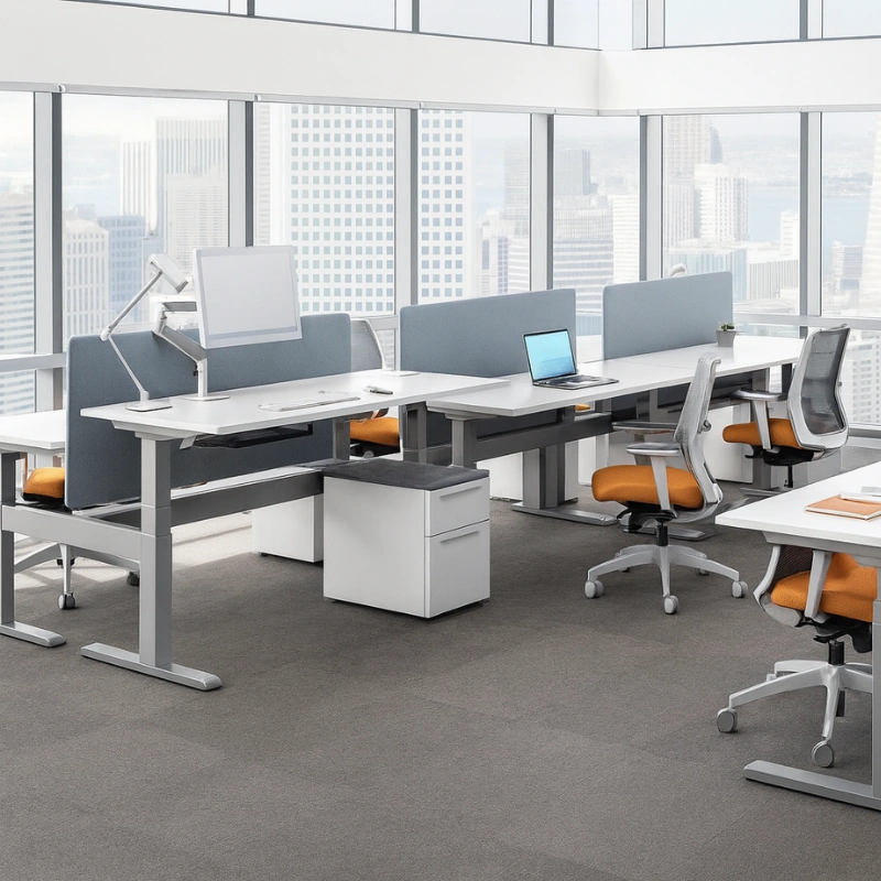 - Adjustable height fabric screens define personal space and add aesthetic appeal.