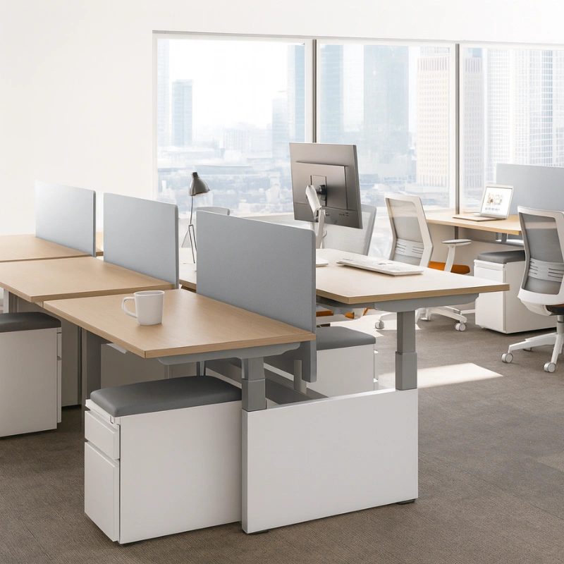 - Height adjustable benching on a per-workstation level, with simple up/down, touch controls. Anti-collision technology offers safety in the movement.