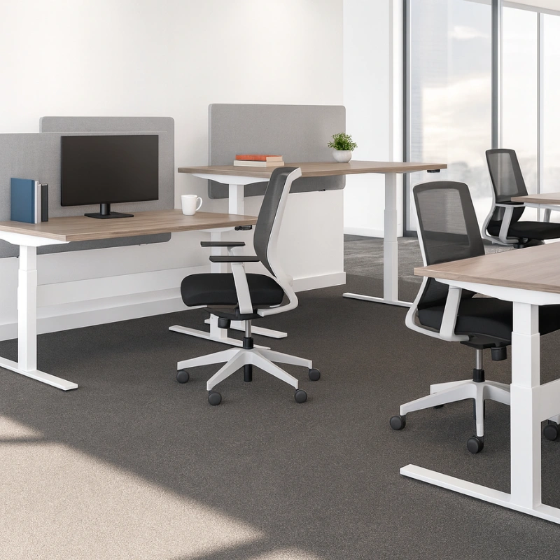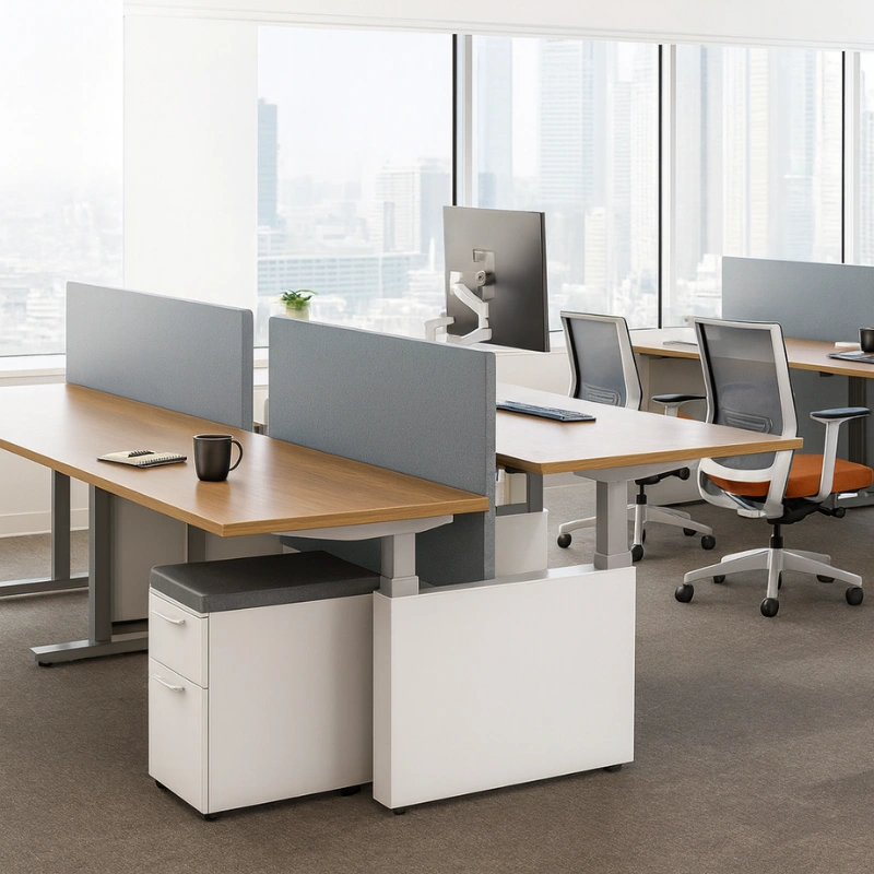 - Adjustable height fabric screens define personal space and add aesthetic appeal.