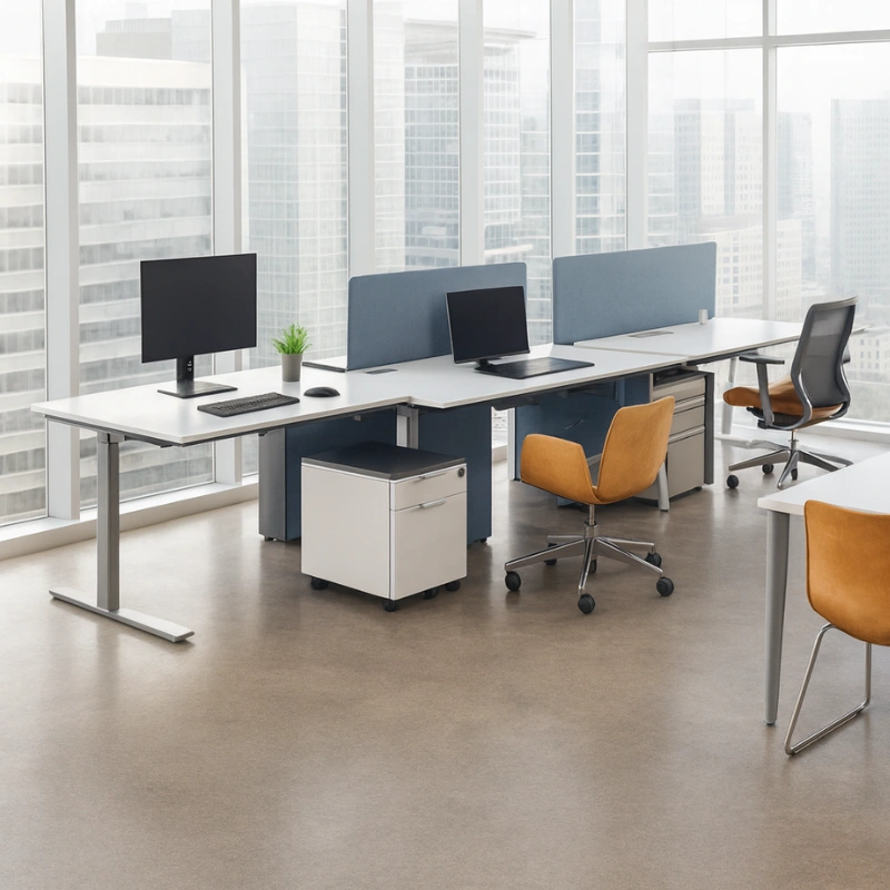 - Height adjustable benching on a per-workstation level, with simple up/down touch controls. Anti-collision technology offers safety in the movement.