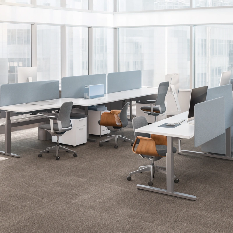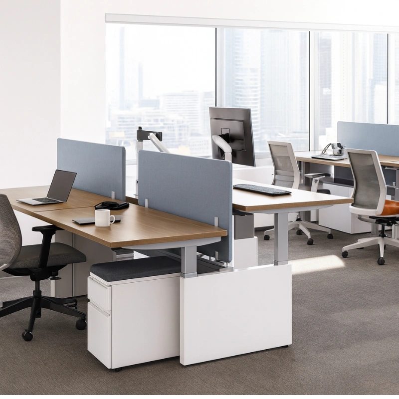 - Adjustable height fabric screens define personal space and add aesthetic appeal.