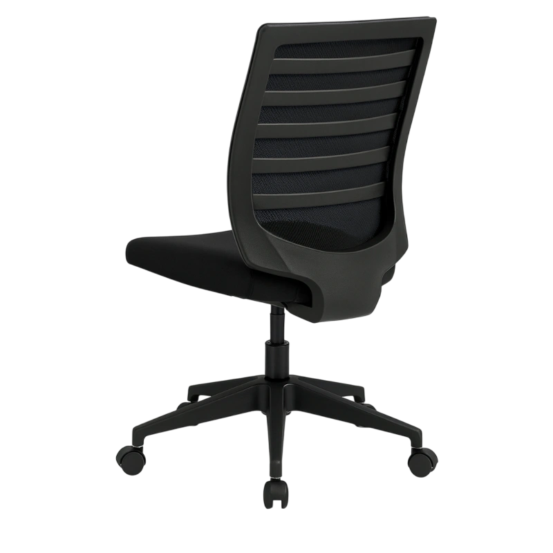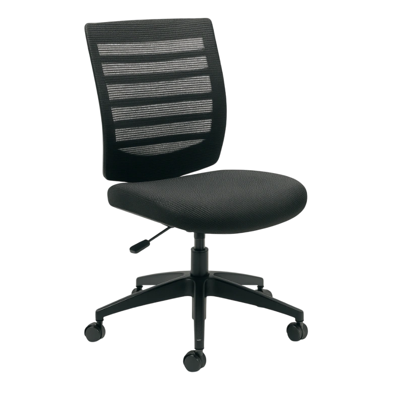 Offices To Go OTG11922B mid back armless task chair features stylish mesh fabric backrest for comfortable lumbar support. Contoured foam seat cushion provides added comfort. The center-tilt mechanism allows the chair to tilt from a point under the center of the seat allowing the user to rock back and forth. Weight capacity up to 250 lbs. Ships ready to assemble.